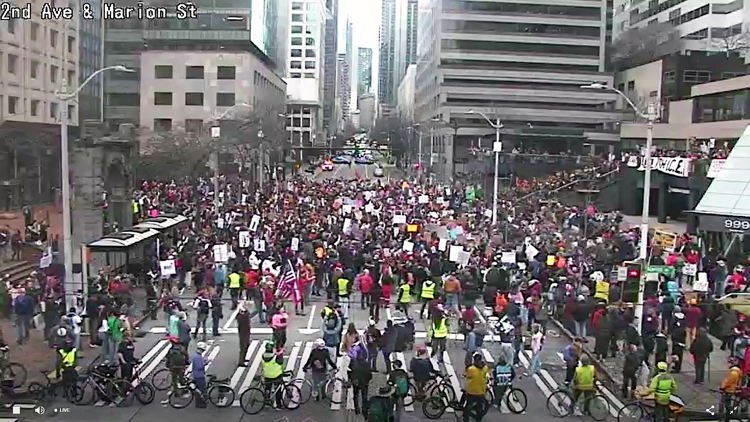 The demonstration continued west on Pine Street, passing 9th Ave and blocking east and westbound traffic. Protesters then moved southbound on 2nd Avenue, passing University Street and blocking southbound traffic.